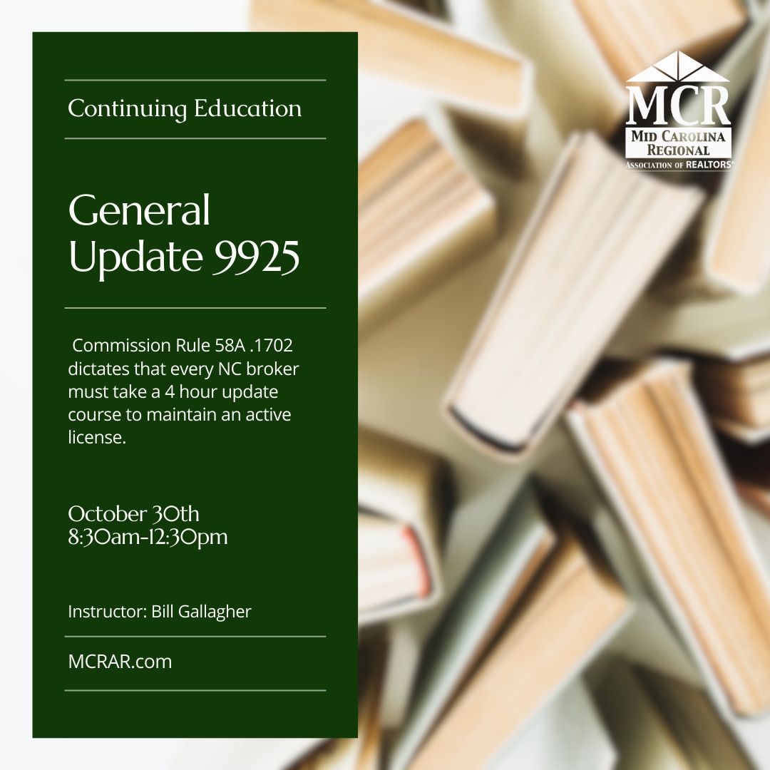 Commission Rule 58A .1702 dictates that every NC broker must take 8 hours of CE each year to maintain active license status (or to maintain eligibility for active status). The 8 hours must be comprised of an Update course (either GENUP or BICUP) and one Commission-approved elective.