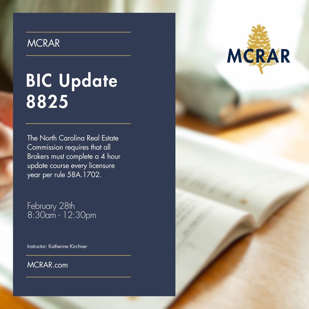 Commission Rule 58A .1702 dictates that every NC broker must take 8 hours of CE each year to maintain active license status (or to maintain eligibility for active status). The 8 hours must be comprised of an Update course (either GENUP or BICUP) and one Commission-approved elective.