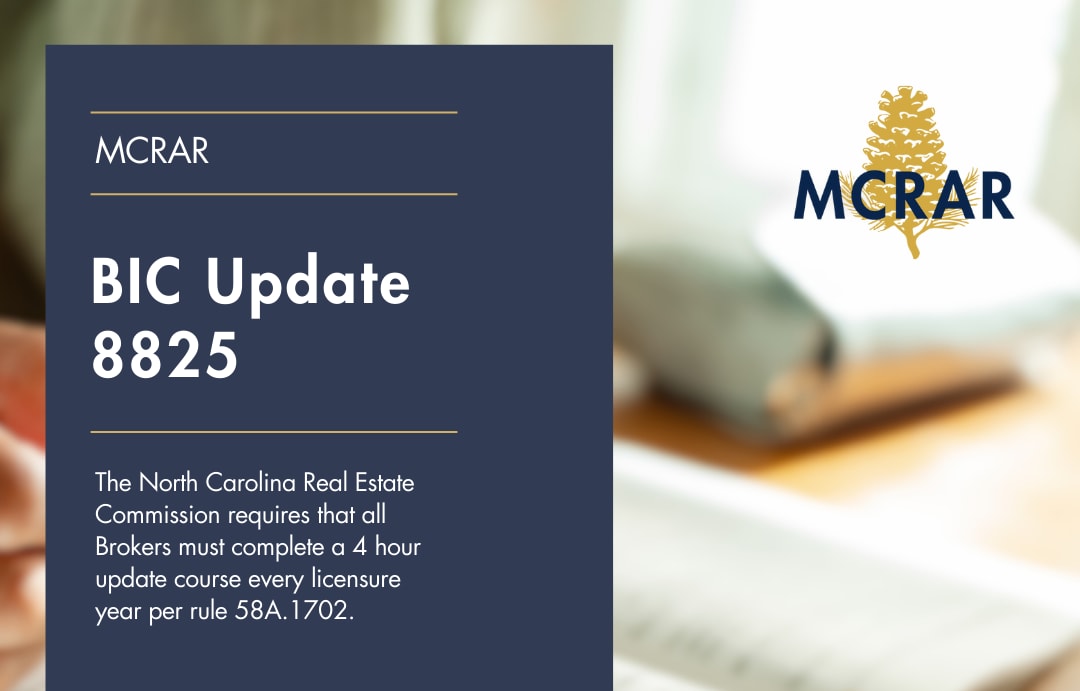 Commission Rule 58A .1702 dictates that every NC broker must take 8 hours of CE each year to maintain active license status (or to maintain eligibility for active status). The 8 hours must be comprised of an Update course (either GENUP or BICUP) and one Commission-approved elective.